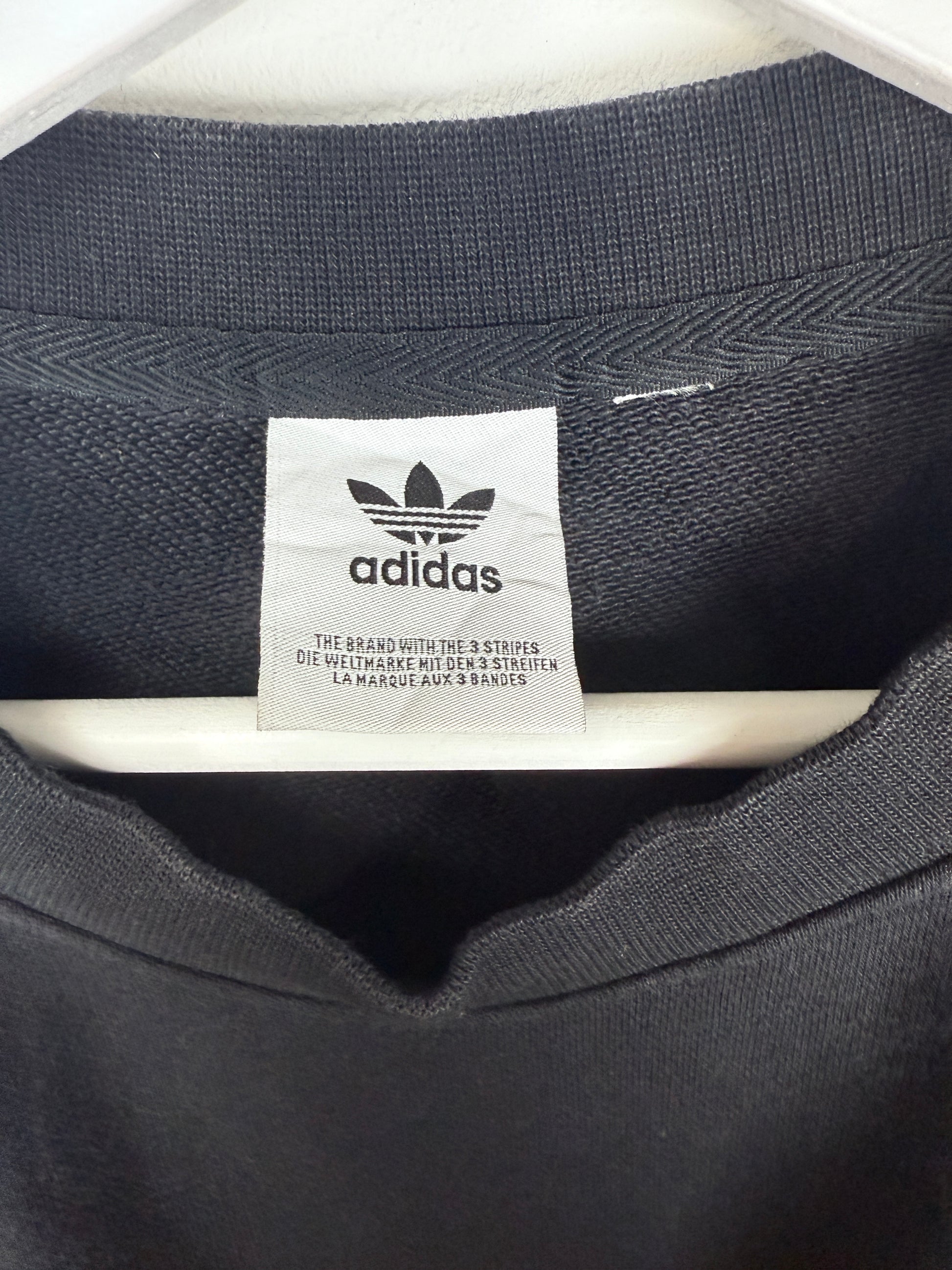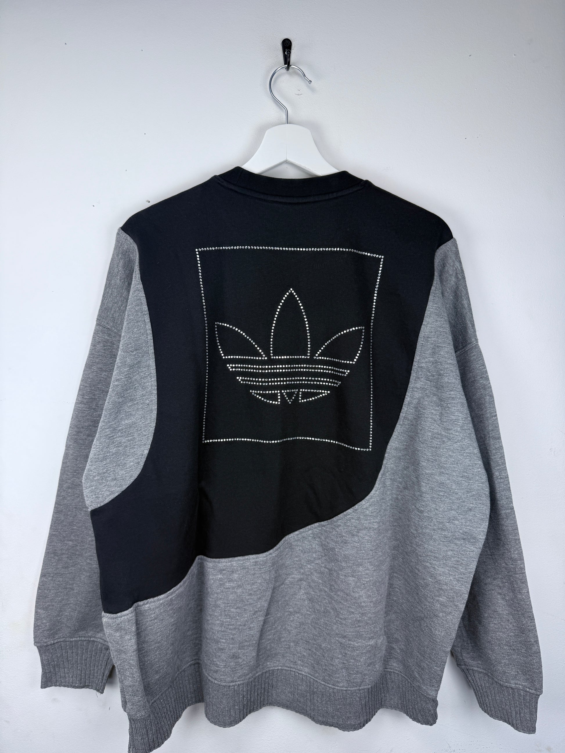 Klassisches Reworked Adidas Originals Sweatshirt in zweifarbigem Design. Schwarzer Mittelteil mit grauen Ärmeln und Saum, kleines gesticktes Adidas Trefoil Logo auf der Brust und glitzernes auf dem Rücken. Zeitloser Streetwear-Look mit sportlicher Attitüde.